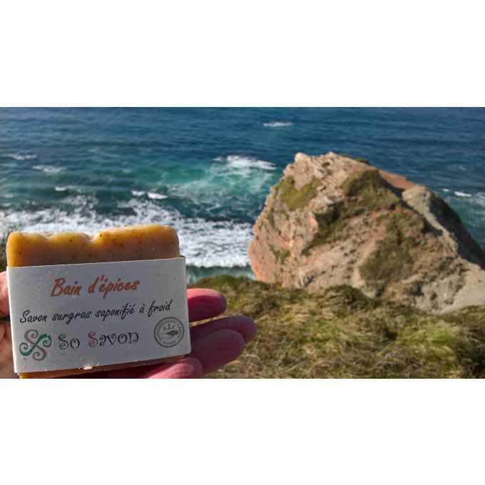 Savon Bain d'épices : Savon surgras saponifié à froid aux huiles essentielles d'ylang-ylang, bois de hô et cèdre.